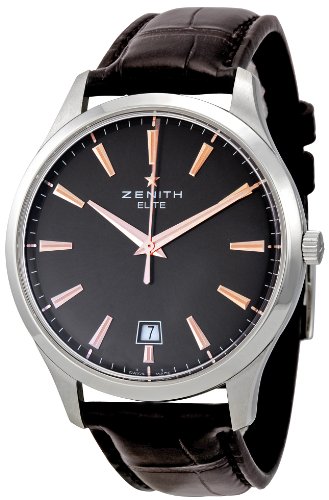 Stainless steel case with a brown leather strap. Fixed stainless steel bezel. Brown dial with luminous rose old-tone hands and index hour markers. Minute markers around the outer rim. Dial Type: Analog. Date display appears at the 6 o'clock position. Automatic movement. Scratch resistant sapphire crystal. Solid case back. Case diameter: 40 mm. Case thickness: 9 mm. Tang clasp. Water resistant at 50 meters/ 165 feet. Functions: hours, minutes, seconds, date. Dress watch style. Zenith Brown Dial Brown Leather Strap Automatic Mens Watch 03206067076C498.